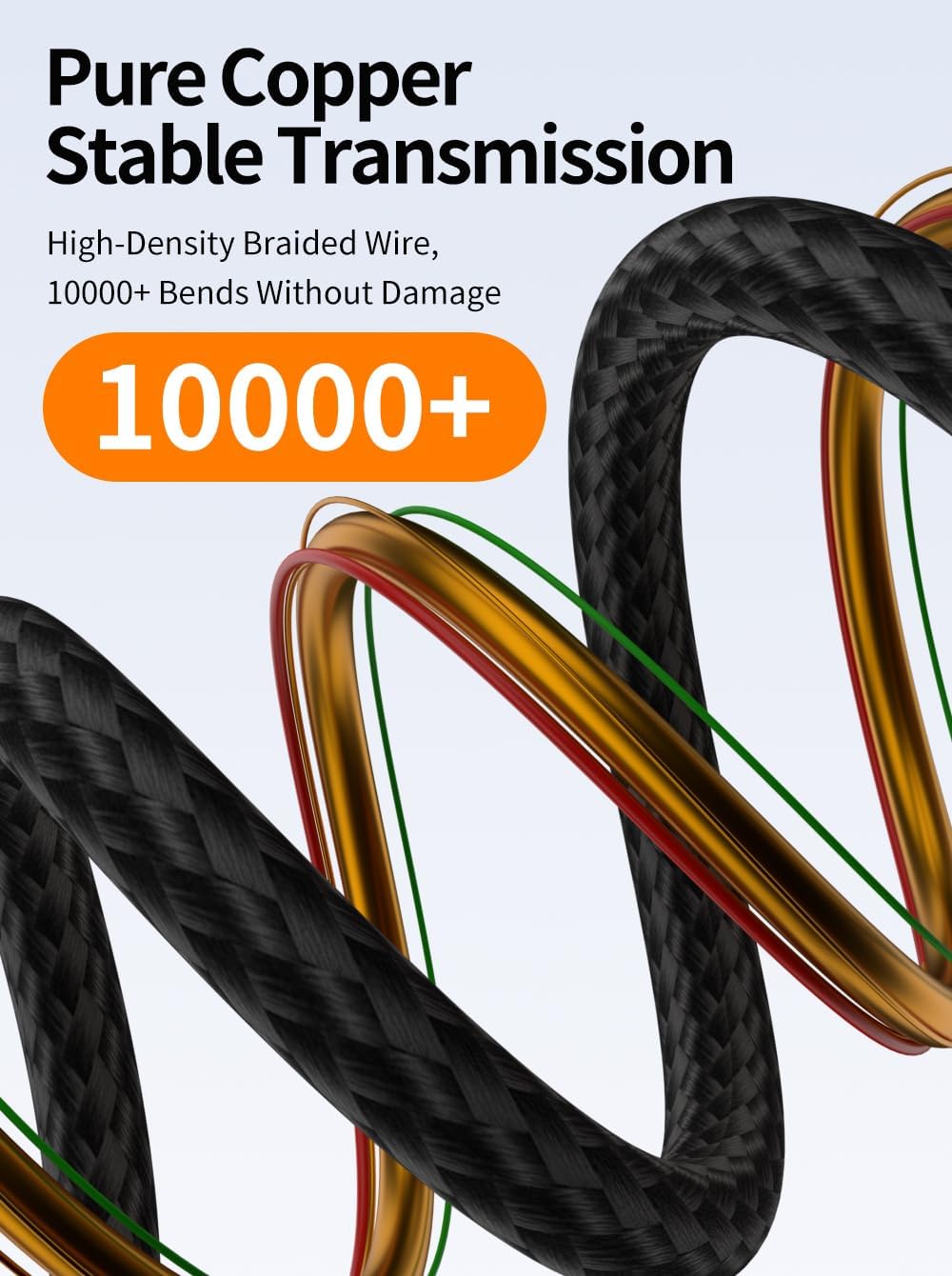 The high-density nylon braided design and pure copper core ensure stable transmission and long-lasting durability, tested to withstand 10,000+ bends without damage.